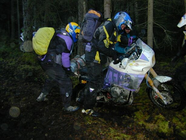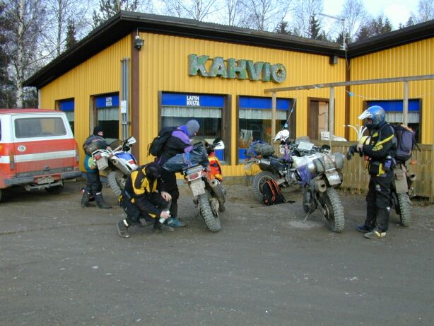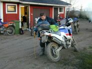Kun Niinisalon harjut oli jälleen koestettu ja erinomaisiksi todettu, sekä Timon "uudenkarhea" tenere yllättävän nopeaksi havaittu, nautimma kello kolmen päivällisen Niinisalon legendaarisessa sotkussa. Perinneruokaa, eli pizzaa siis. Tämän jälkeen kun olimme ihmetykseksemme havainneet olevamme kauempana määränpäästä, kuin aamulla lähtiessämme otimme suuntiman kohti Pystymettää. Hiekkateitä oli jälleen ilo rossailla, ainut ikävä puoli oli n. 60 km järjestäjien viitoittama asfaltti siirtymä, jolla meinasimme jäätyä ja polttaa päreemme. Hikisinä 10 tuntia hiekkateitä ja polkuja tahkottuamme, olisi hieman lyhyempikin "motoristin jäädytyssessio" riittänyt.